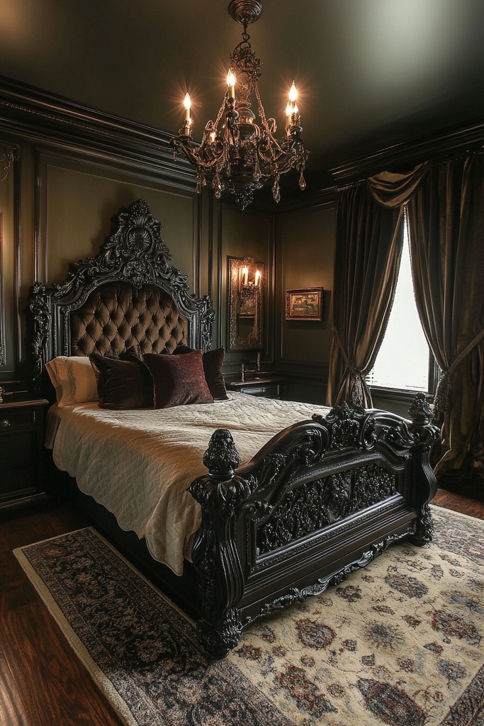 Mix moody sage green with dramatic black accents and ornate Victorian-style furniture for a bold bedroom statement. You’ll create instant drama with an oversized tufted headboard and vintage-inspired black metal light fixtures.