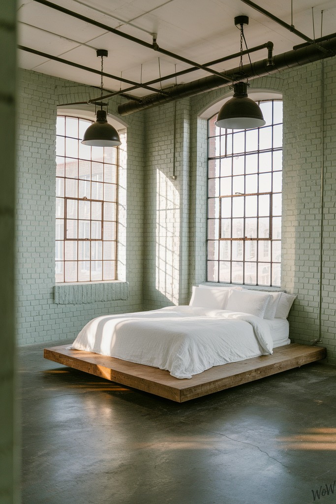 Picture your bedroom with cool exposed brick walls painted in soft sage, paired with metal pipes and black iron light fixtures. Add some raw wood furniture and concrete floors to get that urban feel. You’ll love how the sage color softens the industrial elements, making your space feel both modern and cozy at the same time.