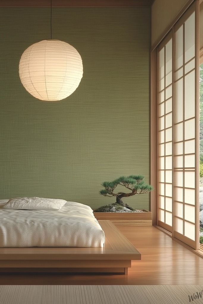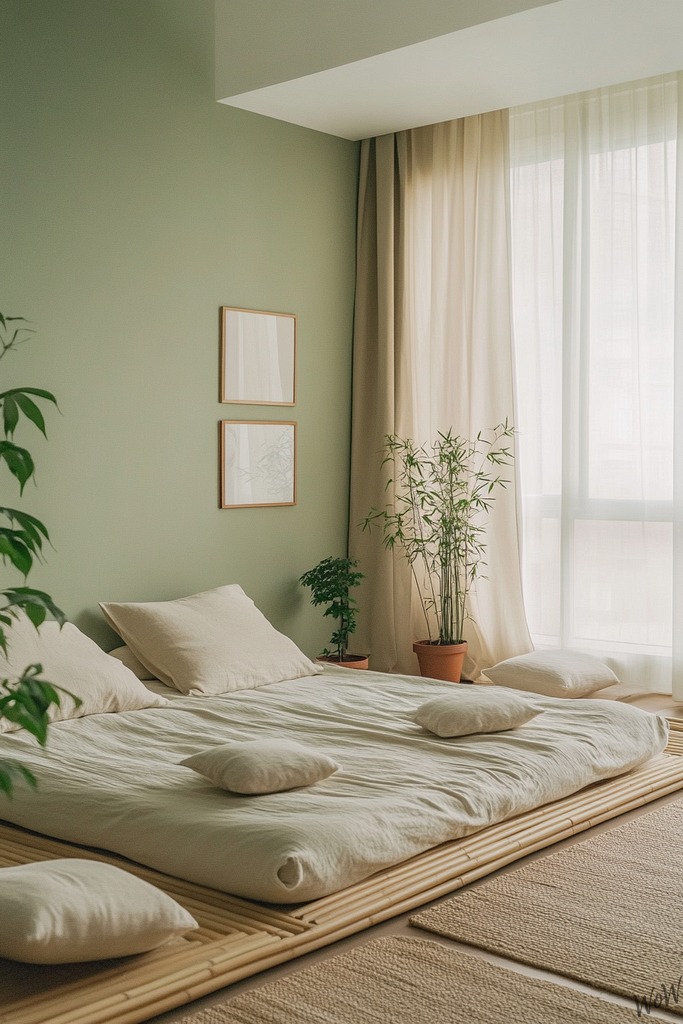 Create zen vibes with sage green walls paired with low-profile furniture and bamboo elements. You’ll want to keep the space uncluttered and add just a few carefully chosen pieces like a paper lantern or a small bonsai tree. Try incorporating sliding panels or screens to divide the space while maintaining that peaceful Japanese aesthetic.