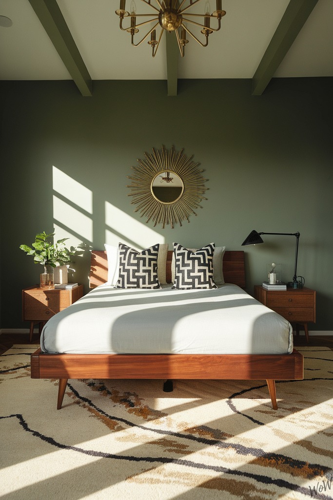 Give your bedroom a stylish retro vibe by pairing sage green walls with furniture that has clean lines and wooden legs. You’ll nail this look by adding a sunburst mirror and geometric patterns in your throw pillows. Keep things interesting with brass light fixtures and a funky area rug.
