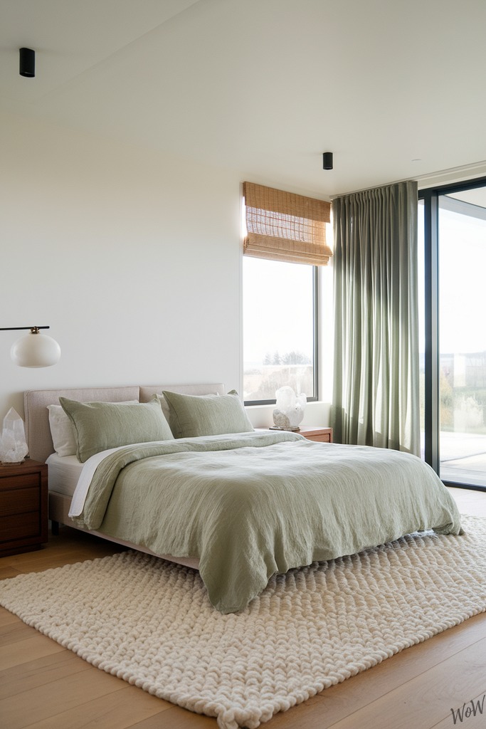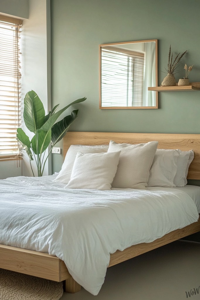 Mix sage green with clean white walls and natural textures to make your bedroom feel super calm and current.