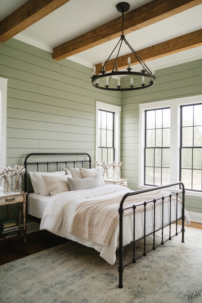 Mix sage shiplap walls with crisp white bedding for that perfect farmhouse look. You’ll love how wooden beams and vintage-inspired light fixtures create a cozy yet modern atmosphere. Add some black metal accents and mason jar vases filled with dried cotton stems to nail the modern farmhouse style.