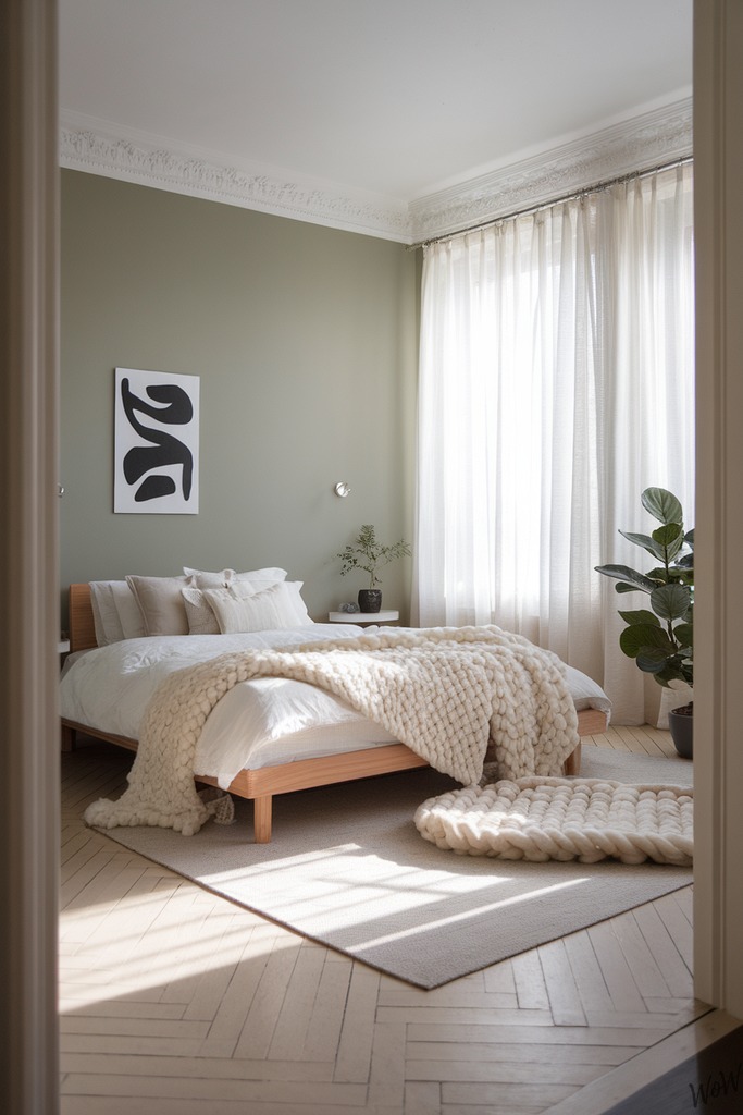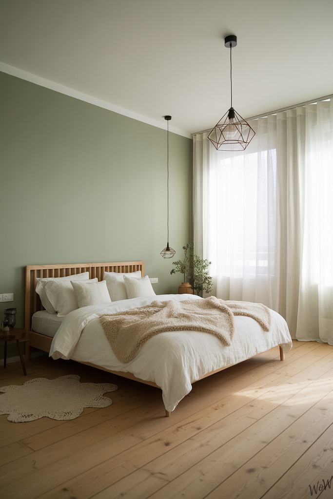 Want a calm bedroom that feels super clean and fresh? Mix sage green walls with white furniture and light wooden floors to get that perfect Scandinavian look. Add some fuzzy white pillows and a chunky knit blanket to make it extra cozy. Try keeping decorations simple with just a few plants and maybe a black-and-white art print.