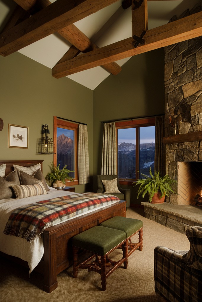 Make your bedroom feel like a cozy cabin by combining sage green with natural wood beams and stone accents. Adding plaid blankets, pine cone decorations, and maybe even a small indoor plant will give you that perfect mountain escape feeling. This style works great if you want your room to feel warm and nature-inspired.