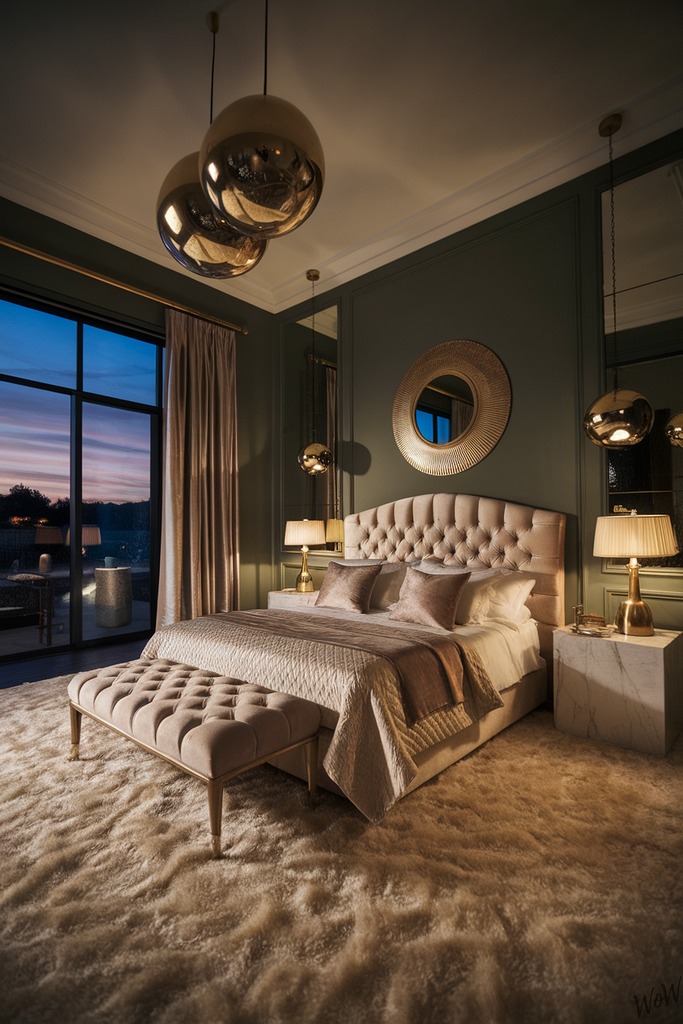 Get ready to feel like royalty with this luxurious combination of sage green and warm brass fixtures. You’ll love how the metallic elements pop against the soothing green walls, especially when you add velvet pillows and a tufted headboard.