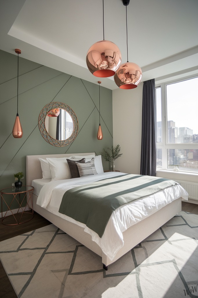 Want to feel like you’re sleeping in a fancy 1920s hotel? Mix sage green walls with shiny gold mirrors and light fixtures. You can create this luxurious look by adding geometric patterns on your bedding and some velvet pillows in deep sage.