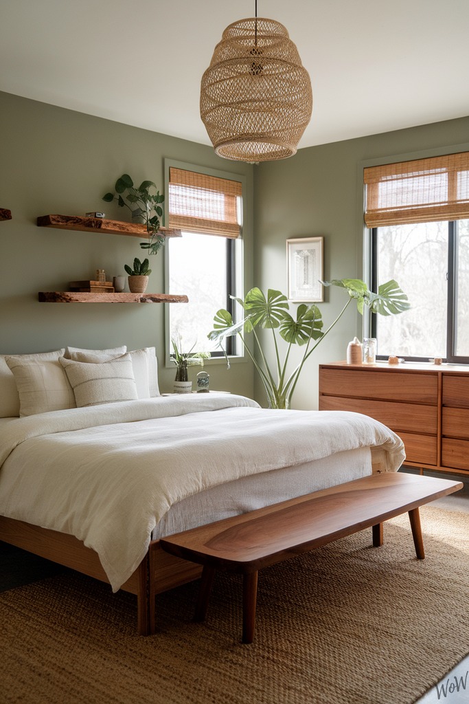 Transform your bedroom into a peaceful sanctuary with calming sage green walls and natural bamboo accents. You’ll love how the soft, muted green creates a meditative atmosphere, perfect for unwinding after a long day.