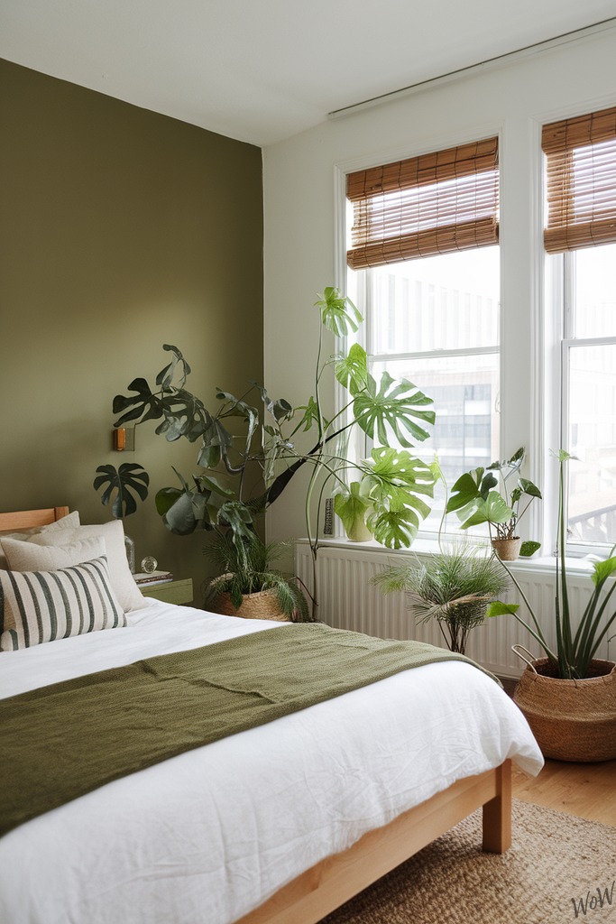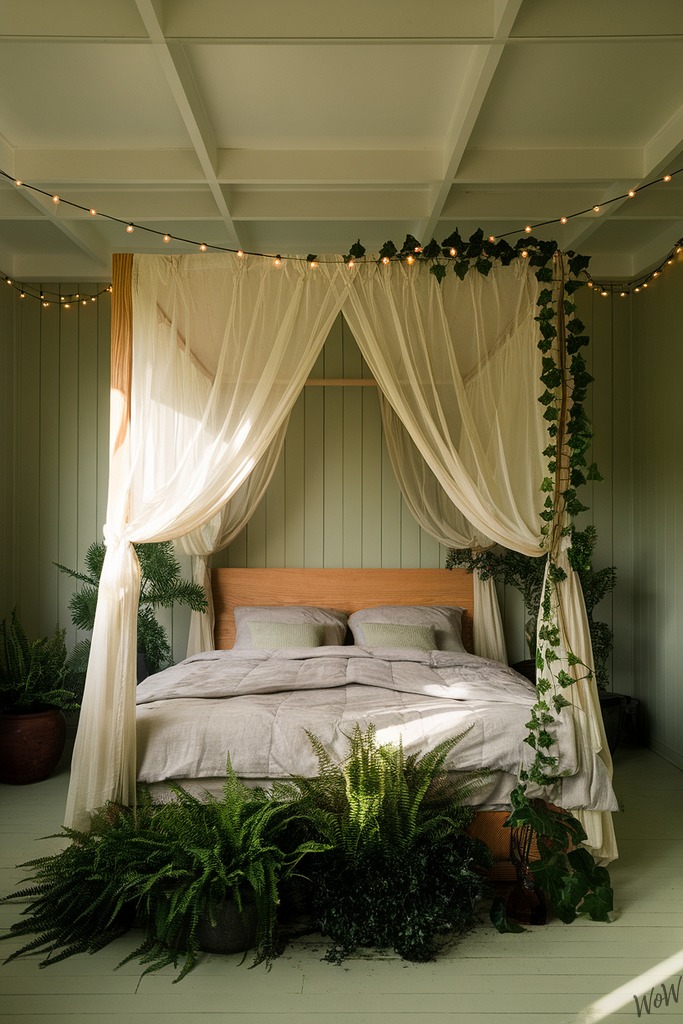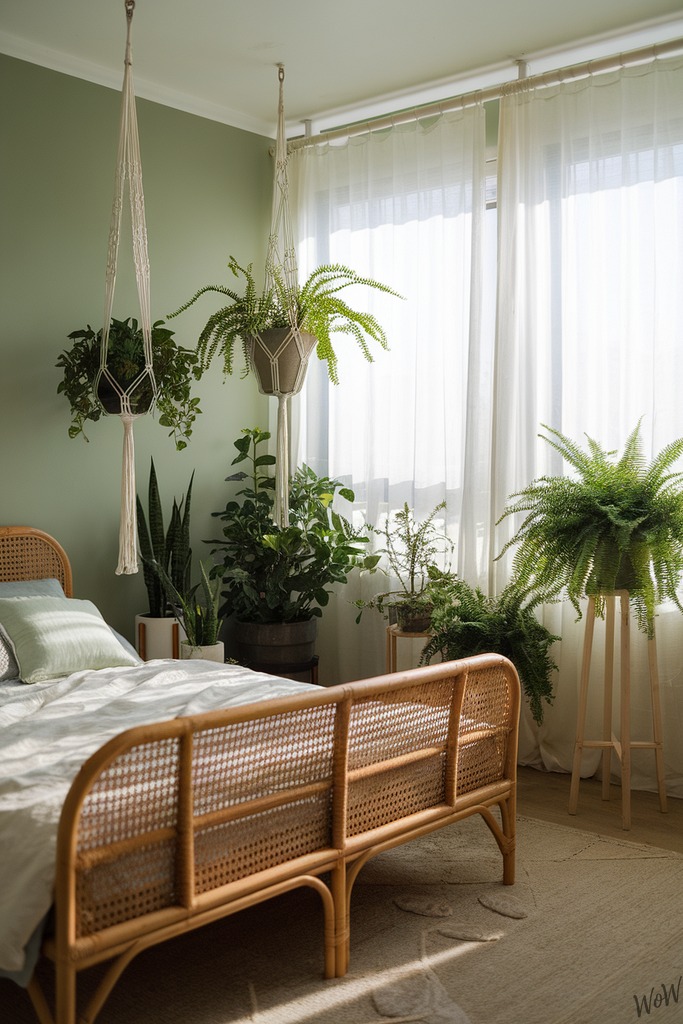 Bring the garden indoors with sage green walls that create the perfect backdrop for your indoor plant collection. You can hang trailing plants from macramé holders and arrange potted ferns on wooden plant stands around your bed.