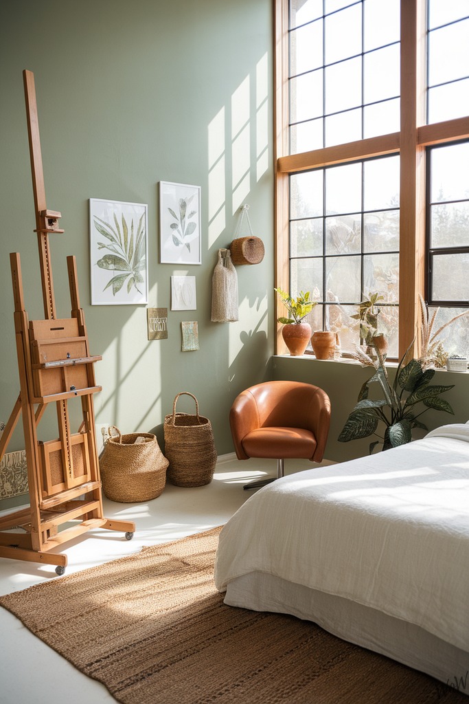 Transform your bedroom into a creative haven by using sage green as your inspiration color! Add an easel in the corner, hang some botanical prints, and place a comfy reading chair near the window. Your artistic spirit will feel right at home with natural textures like woven baskets and clay pots scattered around the room.