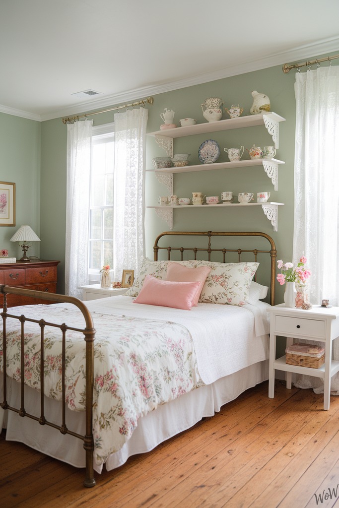 Get that cozy cottage feel by using soft sage green with floral patterns and vintage furniture. You can make your room extra charming by adding white lace curtains and displaying pretty teacups on open shelves. Mix in some rosy pink pillows to make it feel extra sweet and homey.