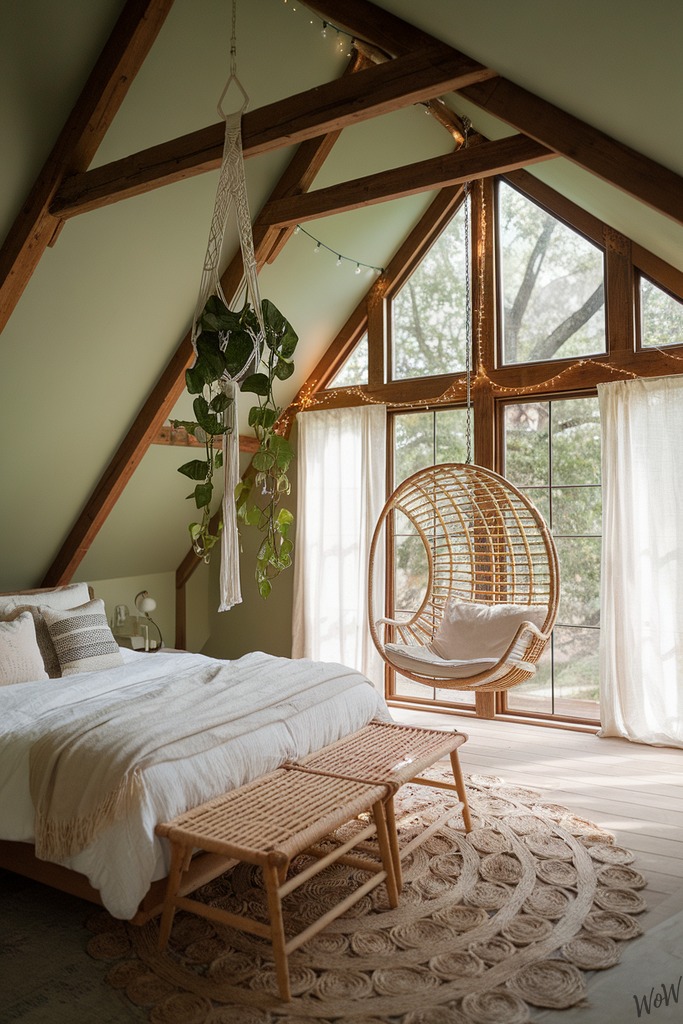 Want to feel like you’re sleeping in a peaceful forest? Paint your walls a soft sage green and add lots of wooden furniture to create a treehouse vibe. You can hang some trailing plants from the ceiling and place a woven rattan chair in the corner to complete the natural look. Try adding some twinkle lights around your windows to make it feel magical at night!