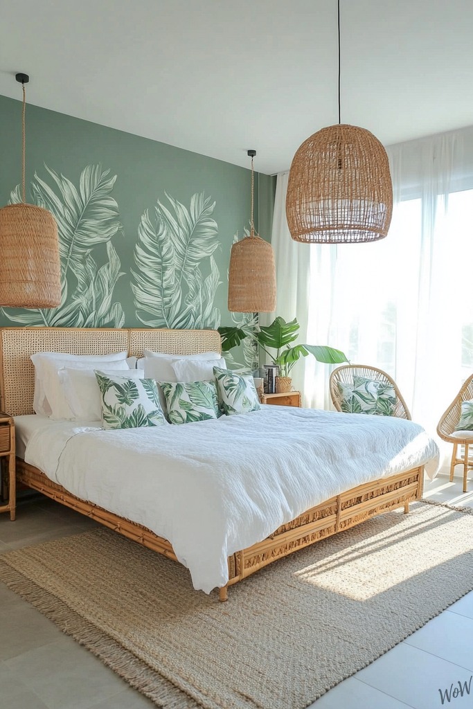 Turn your bedroom into a mini vacation spot! Mix sage green with bold tropical prints and lots of real or fake plants. Add rattan furniture and bamboo decorations to bring in that island feel. For extra tropical vibes, hang up some leaf-pattern artwork and use white bedding to keep it bright and fresh.