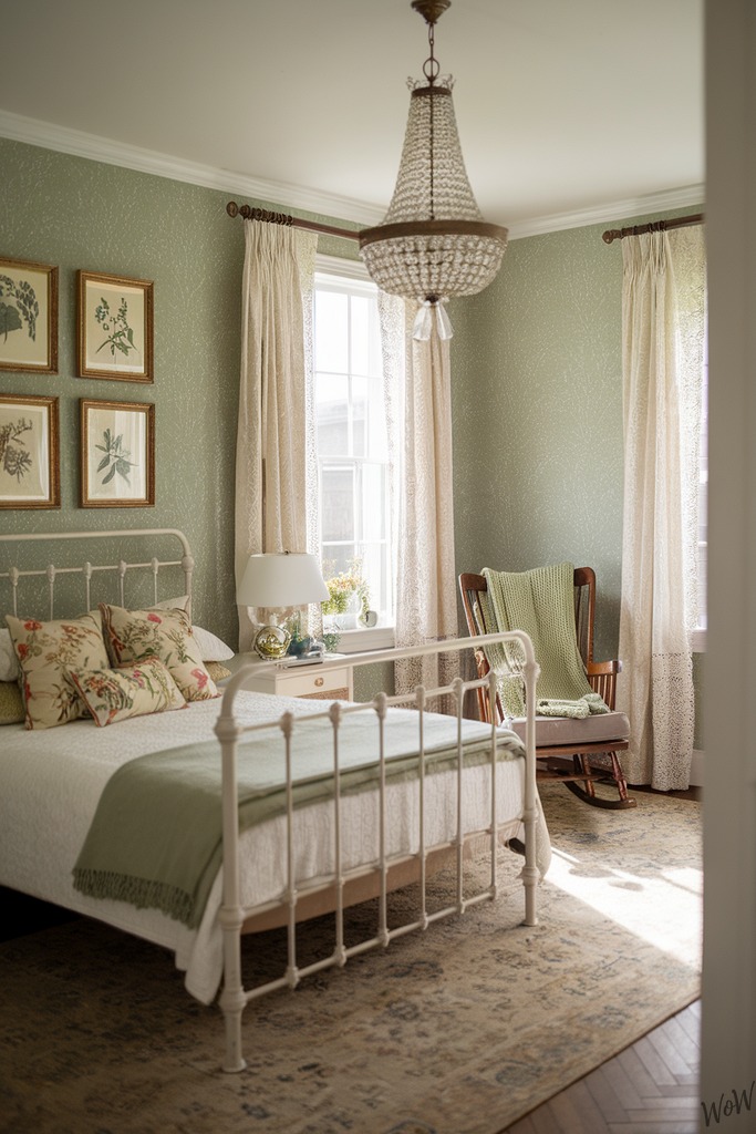 Turn your bedroom into a cozy vintage retreat by using sage green with antique furniture and old-fashioned touches. Find some pretty floral pillows and lace curtains that have hints of sage green, then mix them with an iron bed frame painted white.